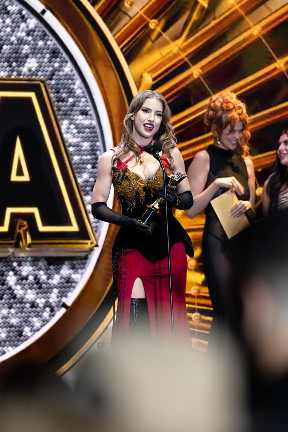 A scintillating Violet Brandani then sauntered onto the stage, teasing the crowd as she slipped off her red coat to reveal matching red lingerie beneath, before awarding the trophy for Creator Platform of the Year to Fansly.
