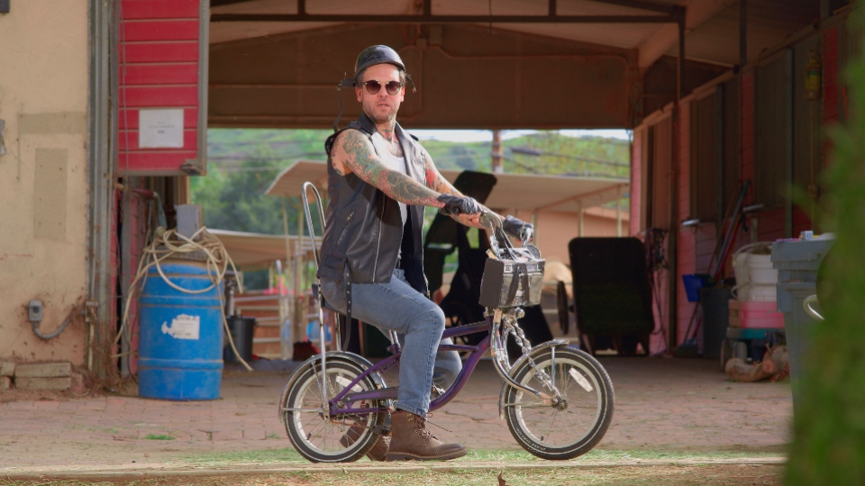 That approach plays out in real time when performer Small Hands’ character, Biker Bob, rides a bicycle he believes is a motorcycle, repeatedly crashing it into a ditch as part of the gag. Between takes, Gamble adjusts timing without losing the tone.